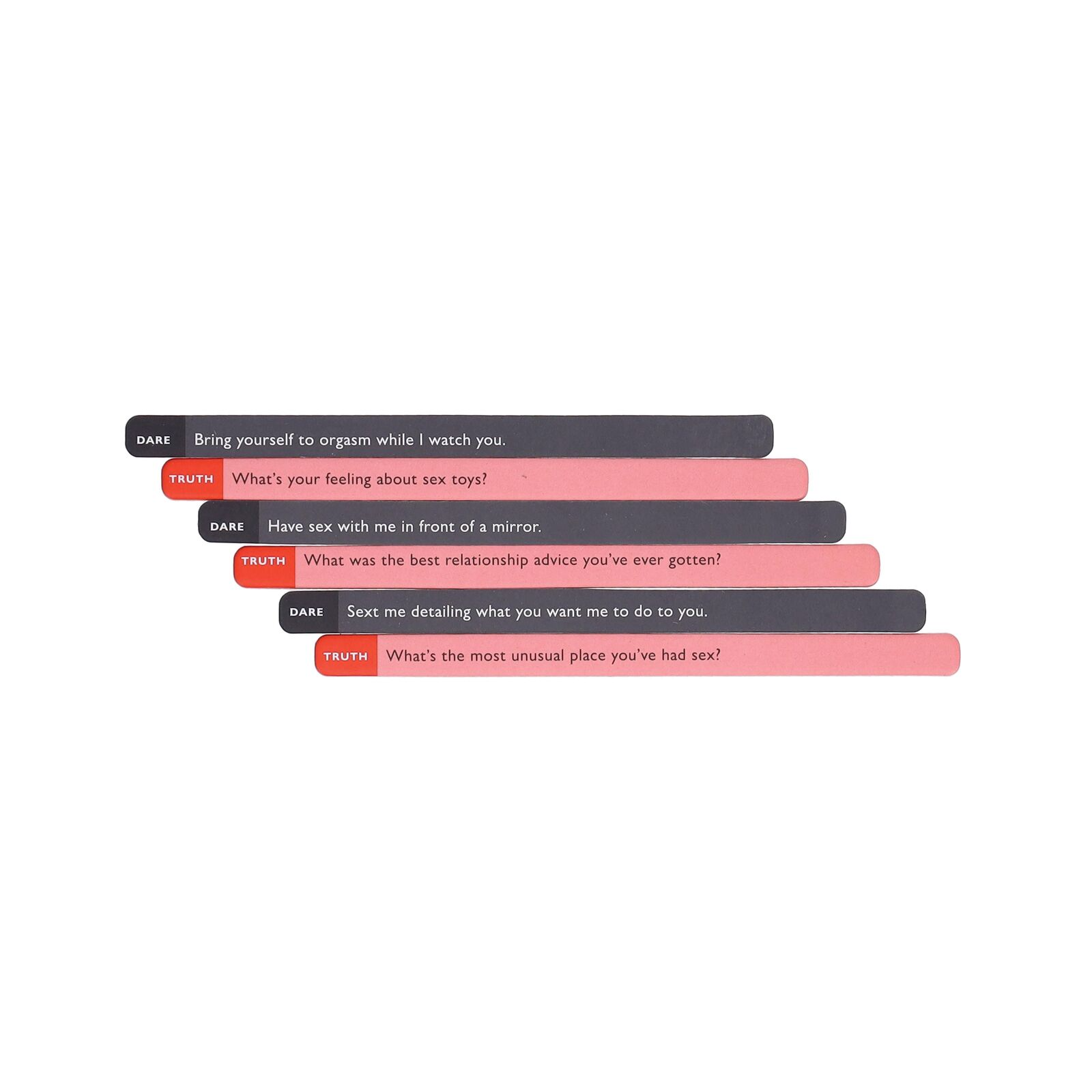Bring out this beautiful box on the next date night to turn up the heat! Pick a stick and choose a "Truth" ("Have you had phone sex?") or a "Dare" ("Let's play a strip version of our favorite board game"). Includes 50 adults-only sticks with Truths on one side and Dares on the other for 100 different ways for partners to learn about each other and their dirty little secrets and indulge in some tantalizing dares, too!