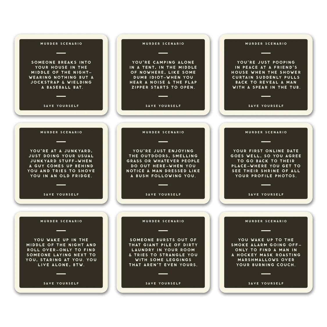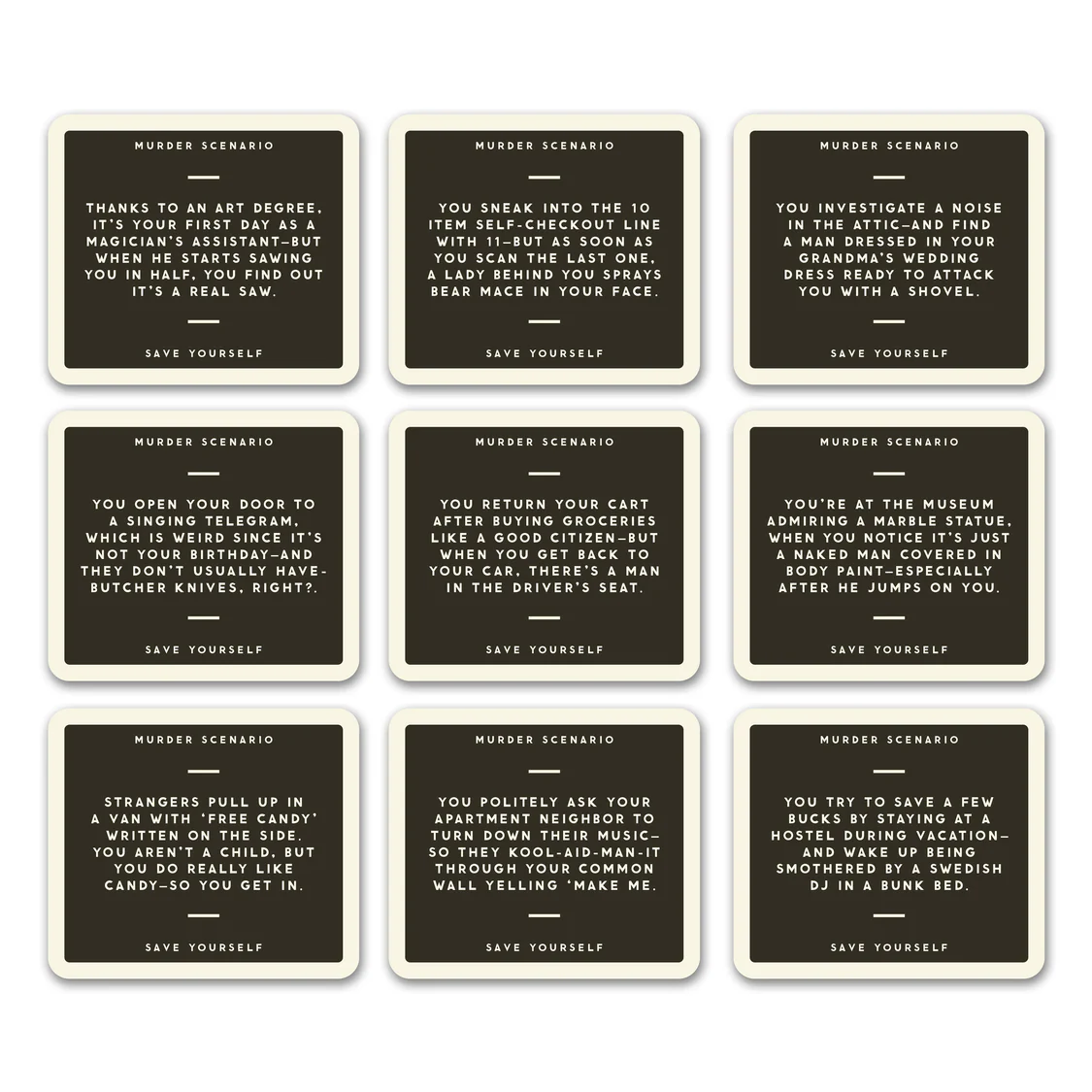 In this hilarious party game by Brass Monkey, players try to devise the best plan to escape from a series of entertainingly ‘murder-y’ situations—but even better, there’s a twist.