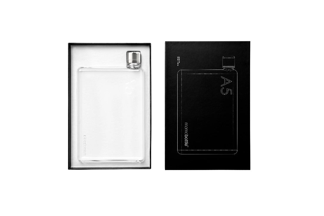 The A5 memobottle fits perfectly in your bag alongside your iPad, books and laptop. Based on the A5 international paper size, its ergonomic shape allows for a Tetris style fit. The A5 memobottle is the companion you have been looking for to keep you healthy, hydrated and stylish. With an elegant form and minimal appearance, the A5 memobottle will easily become part of your daily routine to stay healthy and hydrated. The transparent exterior turns ordinary H20 into a mesmerising and playful work of art, that also encourages you to increase your daily water intake. Add a vitamin boost to every sip by placing a few blueberries or strawberries inside. Your A5 memobottle is paired with a black and white lid all encased inside premium recycled packaging; a perfect gift for yourself or a loved one. The striking design and shape of our memobottles have won multiple design awards and are exclusively trademarked, so rest assured you have the authentic and original memobottle, which is crafted from the highest quality BPA, BPS-free plastic and backed by a 2-year manufacturing warranty. Boasting a 750ml capacity, the A5 memobottle allows you to stay focused and be more productive. It’s the only reusable water bottle you will need, which in turn will help reduce single-use water bottle consumption. It's so easy to clean your memobottle. Simply wash with warm water and vinegar. Not suitable for the dishwasher or carbonated liquids. Capacity: 750ml Easy to clean Black and white lid included BPA-BPS Free Plastic Max Temperature: 50 degrees Celsius Dimensions: 243mm x 148mm x 30mm.