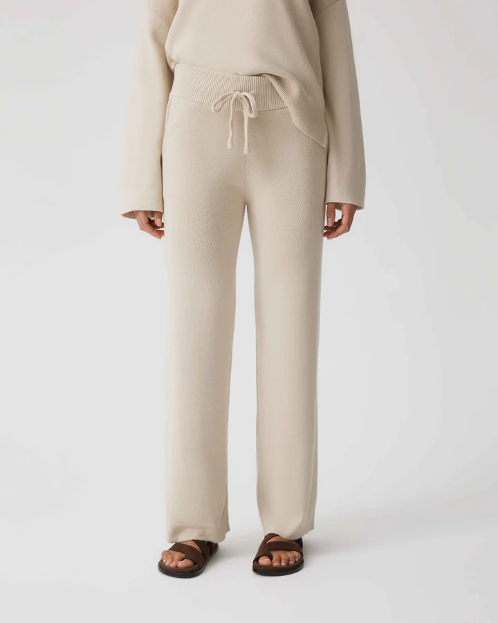 A versatile Cotton Cashmere Pant designed for everyday layering. Made from a premium blend of cotton and cashmere, it features an elasticated waist tie detail and functional pockets.