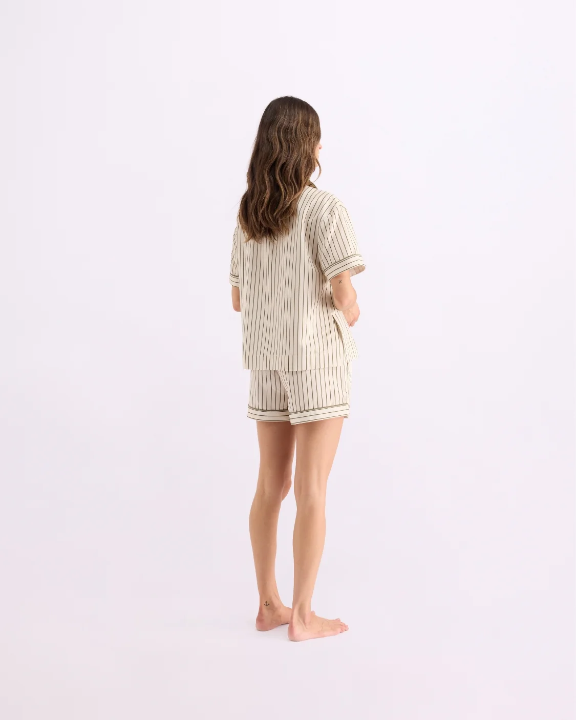 Complete outfits and elevate nightly routines with our short sleeve shirt. Crafted with comfort in mind, this classic silhouette features playful piping details, lapel collar and self-covered buttons for both slumber and style. Exceptionally soft and breathable, our short sleeve shirt is durable and silky to the touch. Designed to be mixed and matched, combine printed stripes and solid colourways to suit your personal style—or pair it with other wardrobe staples for easy, everyday dressing.