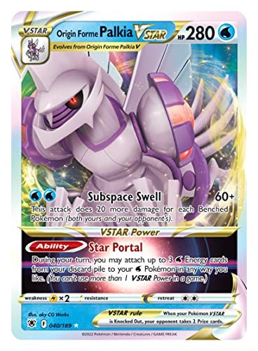 Open a Star Portal to gather power and unleash a Subspace Swell with Origin Forme Palkia VSTAR! This Pokémon VSTAR is yours in this powerful, League-ready deck for skilled Pokémon TCG players. With premium foil cards, sought-after power cards, and a well-tuned set of Pokémon and Trainer cards, the Origin Forme Palkia VSTAR League Battle Deck does more than feature a Legendary Pokémon of the Sinnoh region: it puts together all the elements to support you in your next match against friends and neighbours, in person or online!